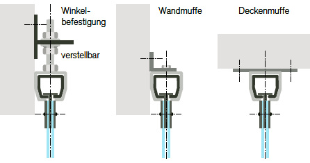 werden in robuster U-Profil-Halterung montiert und eignen sich besonders für stärkere Beanspruchung. Mit einer Muffe kann die U-Profil-Schiene vor oder unter Sturz befestigt werden. Die Schienen aus verzinktem Stahl sind bis 6000 mm Länge erhältlich und können mit Muffen verbunden werden. Bis 2,50 m Breite ist eine selbsttragende Montage möglich.